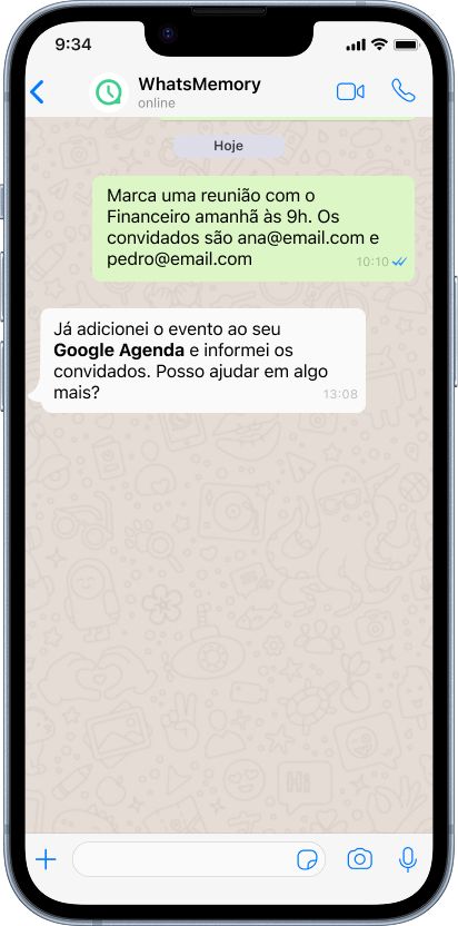 Crie, edite, cancele ou convide contatos por WhatsApp. Consulte sua agenda e seus compromissores a qualquer hora e receba resumos diários de seus compromissos.