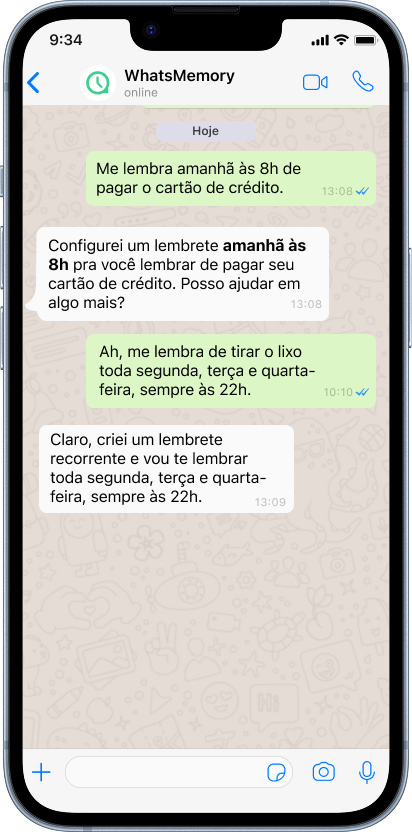 O Whatsmemory te lembra todos os dias, todas as semanas ou sempre que você precisar. Medicamentos, pagamentos, reuniões ou qualquer coisa que você não queira mais esquecer.